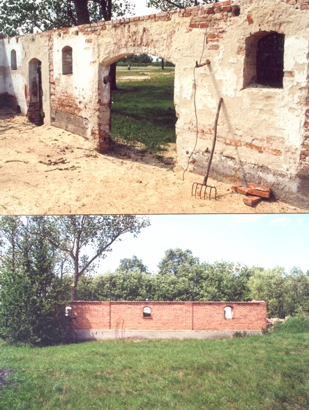 po prawej stan opuszczonej ceglanej obory przed adaptacją