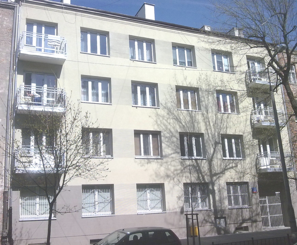 Warszawa-Szmulowizna, ul. Siedlecka 23, termodernizacja kamienicy z lat 40-tych z odtworzeniem balkonów i nową elewacją